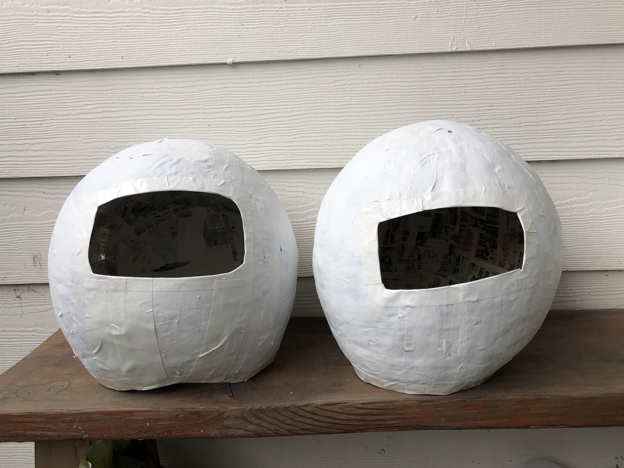 Inflate a balloon to the size of the helmet you wish to make. I measured my kid’s head diameter and distance from top to neck. Place balloon on a box or bowl to keep it elevated; add tape to secure as needed.